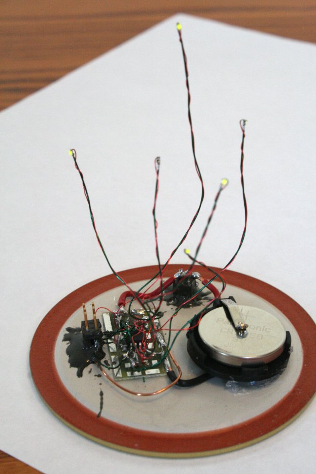 This was by far the smallest soldering work I have ever done. The surface mount components on the board weren’t too difficult, but soldering the tiny 0603 size LEDs to magnet wire was a challenge. In retrospect, I think this might have looked just as good using regular through-hole diffuse LEDs (the ones on the prototype board), and been a lot easier to build. I attached the switch and header to the underside of the lid with J-B Qwik to keep them immobilized.
