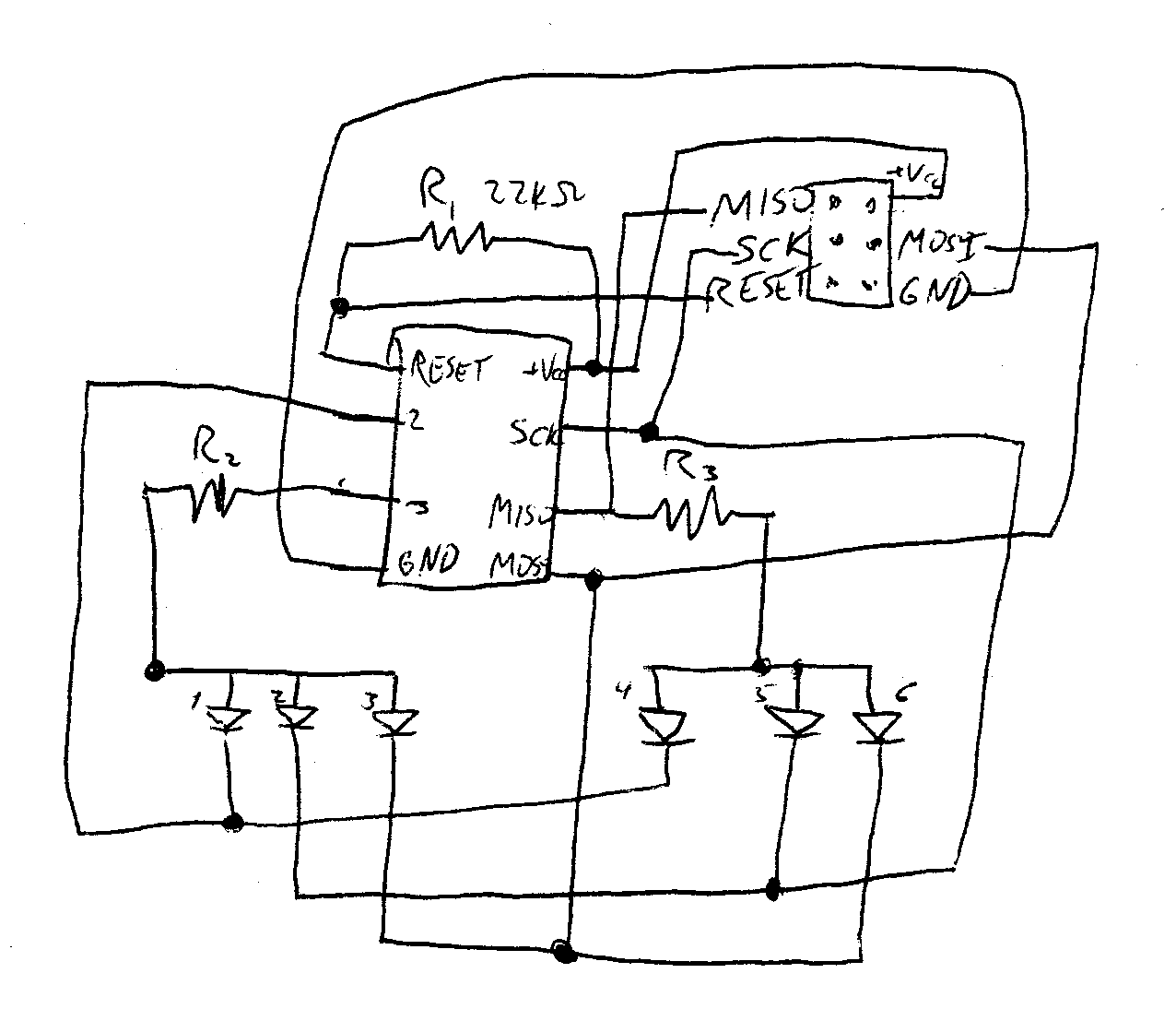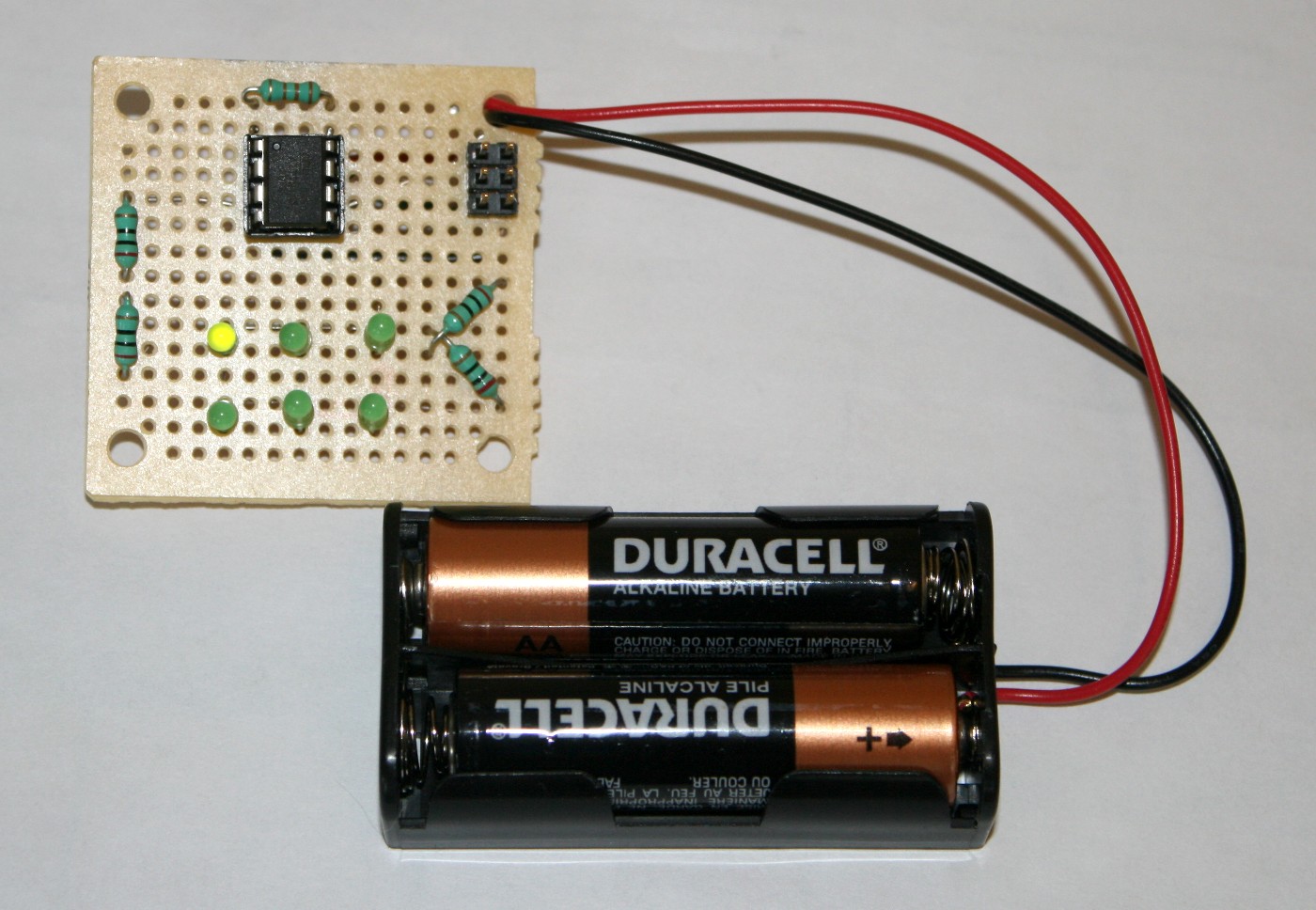 The prototype board can also be used as a target board for programming ATtiny85 (and -45) chips for other purposes. You will need some type of programmer to transfer the program to the microcontroller; I used the USBtinyISP from Adafruit industries.